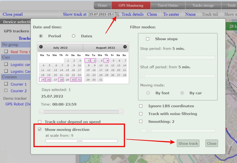 Select a date and click the “Show track” button