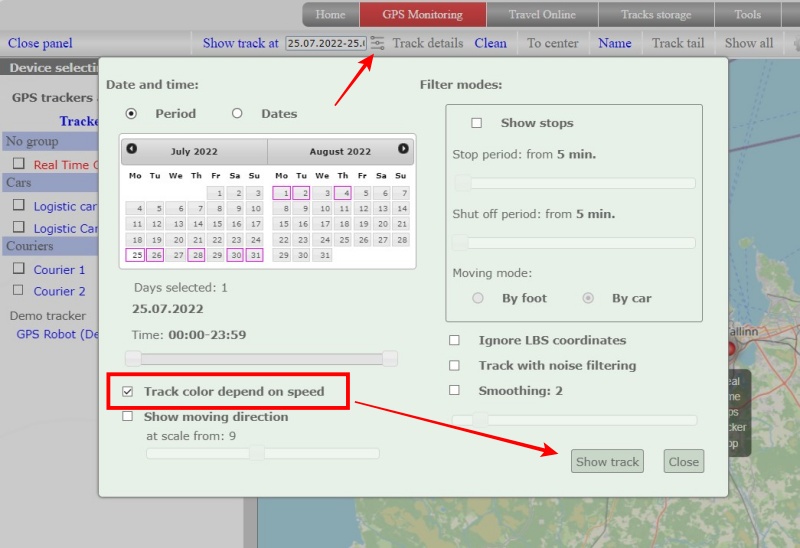 Select a date and click the “Show track” button