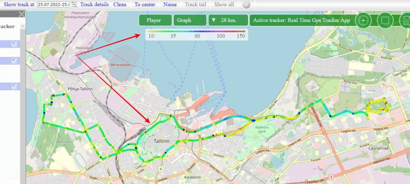 Depending on the speed, the track will be displayed with a different color indication. An information scale will also appear on the map, showing which color corresponds to a certain speed.