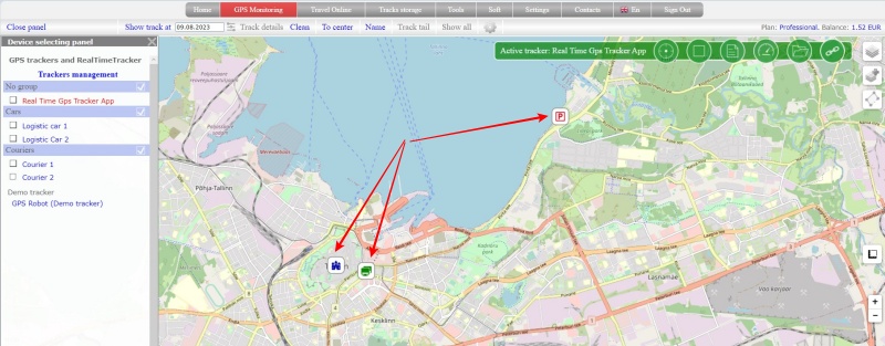 Only 3 objects are displayed on the map. This happened because one of the features was set to “Only for geofences”. At the moment, the “Real Time Gps Tracker App” device is selected as active. On the map you can see the object with the icon “P” (object only for this tracker). If you switch to any other device list object, the “P” object will no longer be displayed.