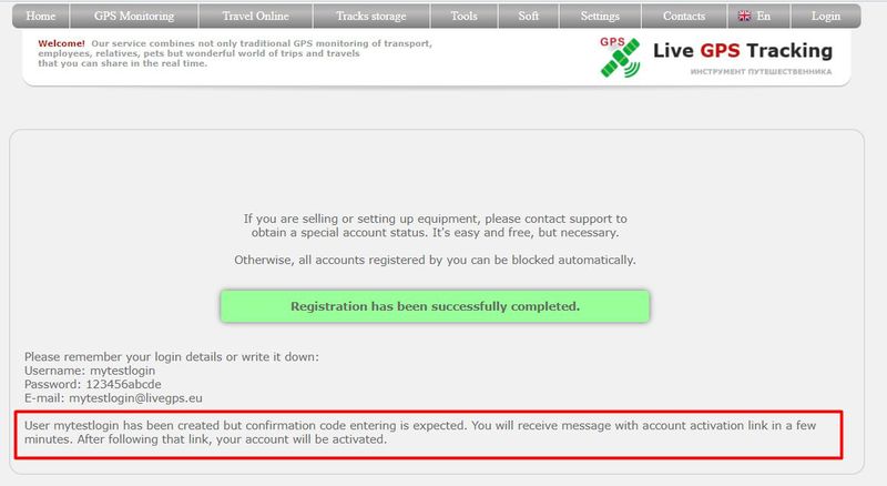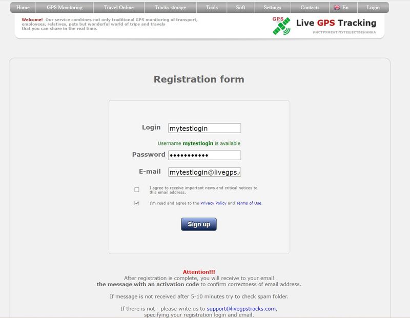 If the registration confirmation email has not arrived after more than 30 minutes, please contact support: support@livegpstracks.com