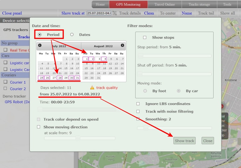 - When building a track for a period, you cannot select a time. The track is being built from 00:00 of the first day to 23:59 of the last day