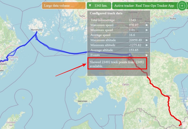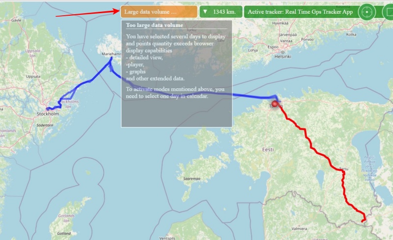 After the track appears on the map, several panels will also appear. One of them is “Large data volume…”. This means that the number of track points for the selected period exceeds the ability to display them all. If you click on this panel, an information window with a detailed description will be opened.