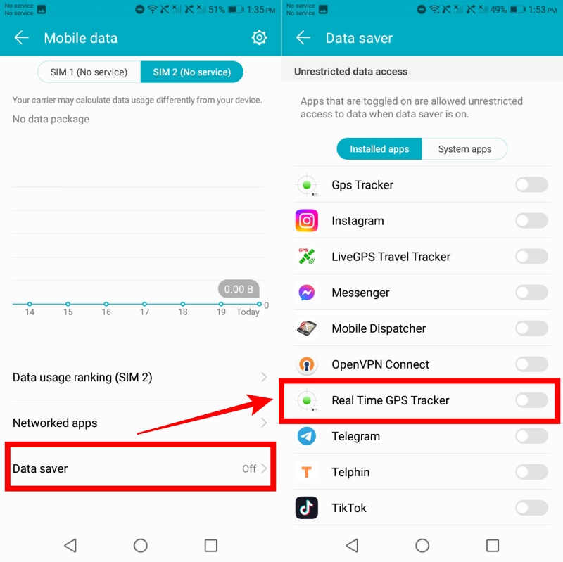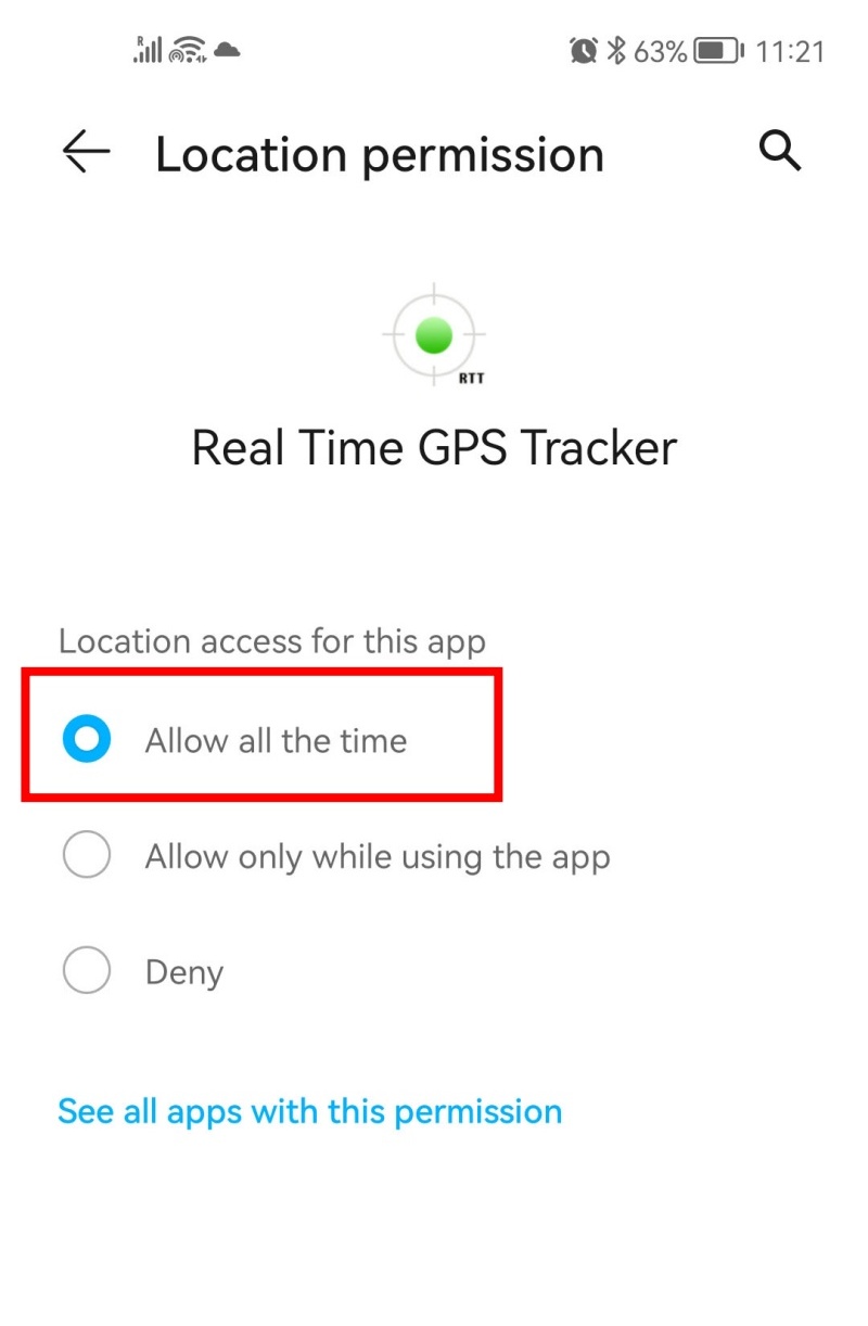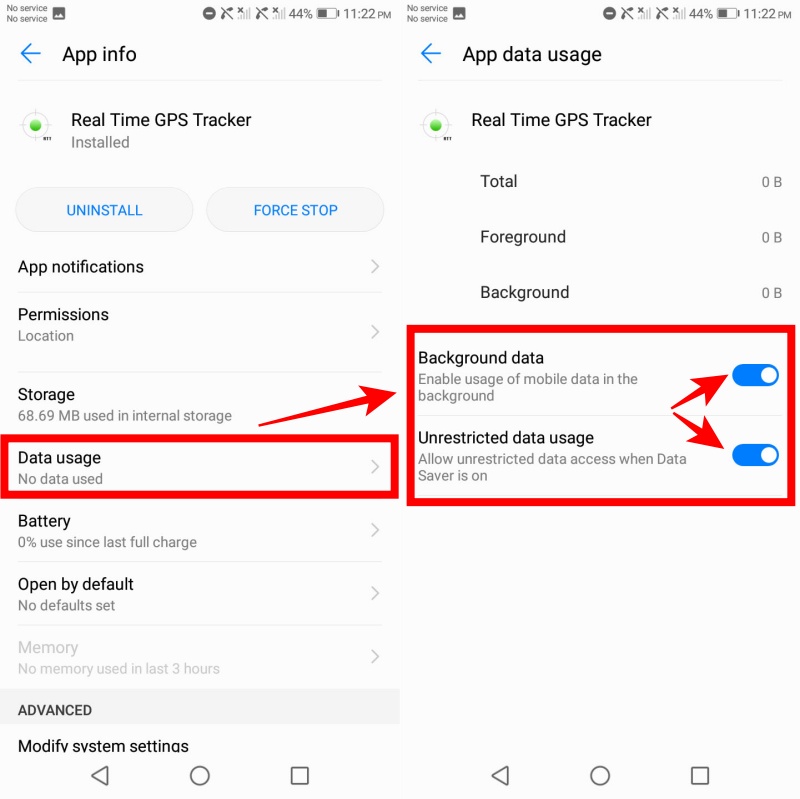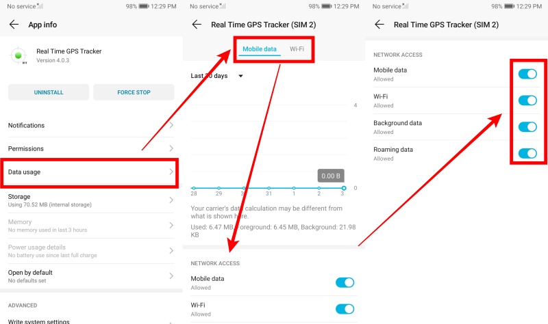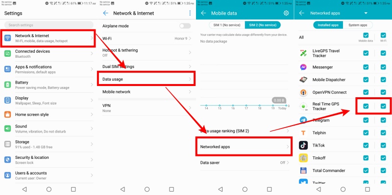 The RealTimeTracker app should be checked in all items - “Mobile data”, “Wi-Fi”.