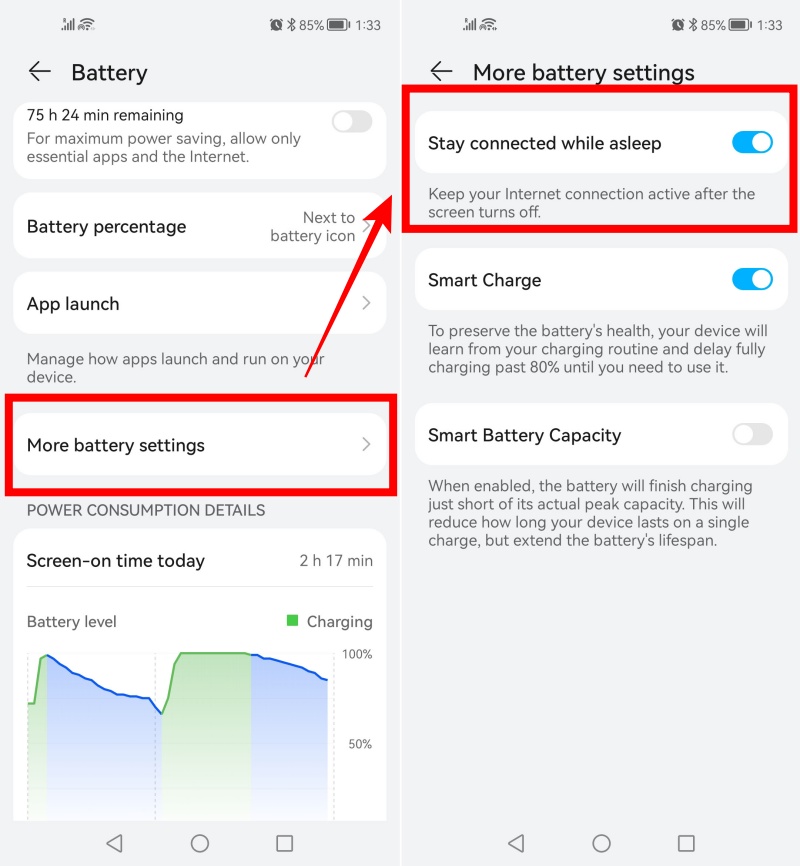 On Android 9 and 10, the settings are located under “More Battery Settings” (or “Other Battery Settings”):