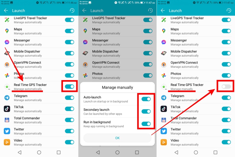 Find the Real Time GPS Tracker application in the list, press on app name, the “Manage manually” option must be set.