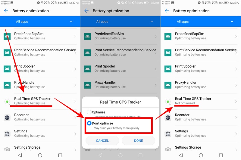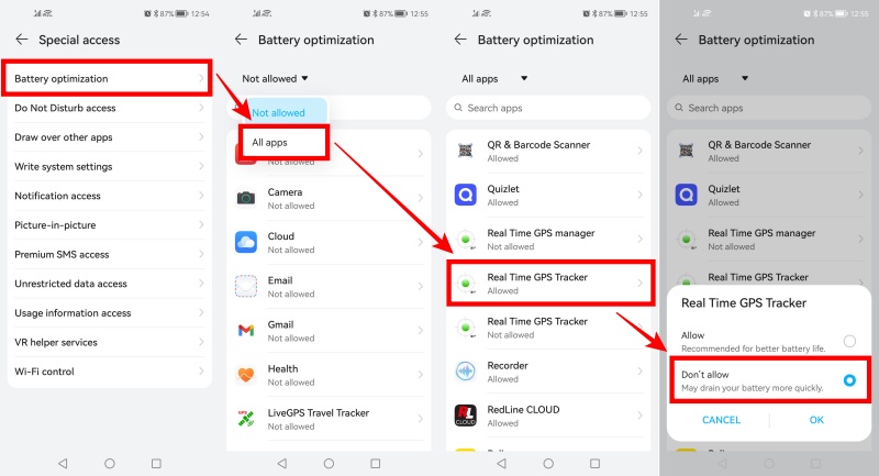 From the drop-down list, select “All Apps” and find the Real Time GPS Tracker app. Click on the app name and in the dialog box that appears, select the option to not save battery.